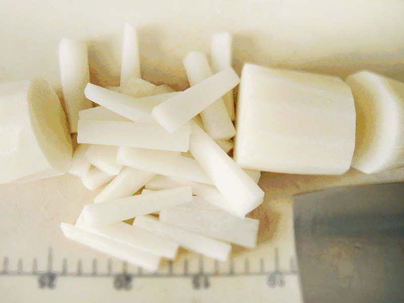2. 萝卜块冷水下锅焯煮,开锅3-4分钟后加少许盐,捞出过凉;