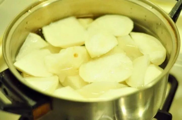 1. 萝卜洗净磨碎,倒入锅中,加水,炖10分钟,适当地搅拌以防变黄,煮到锅中剩下200ml左右的水和萝卜丝,倒入一个大碗中放凉;