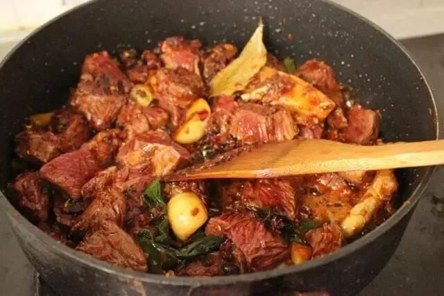 3. 加入豆瓣酱炒至油色红亮,加入牛肉块炒变色;