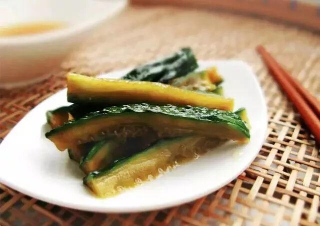 用腌好萝卜的酱汁再腌一次黄瓜(2根),腌一天后即可食用。