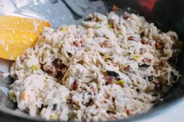 2. 甜面酱加入生抽、黄酒、白糖拌均,放入腌好挤去水分的萝卜条;